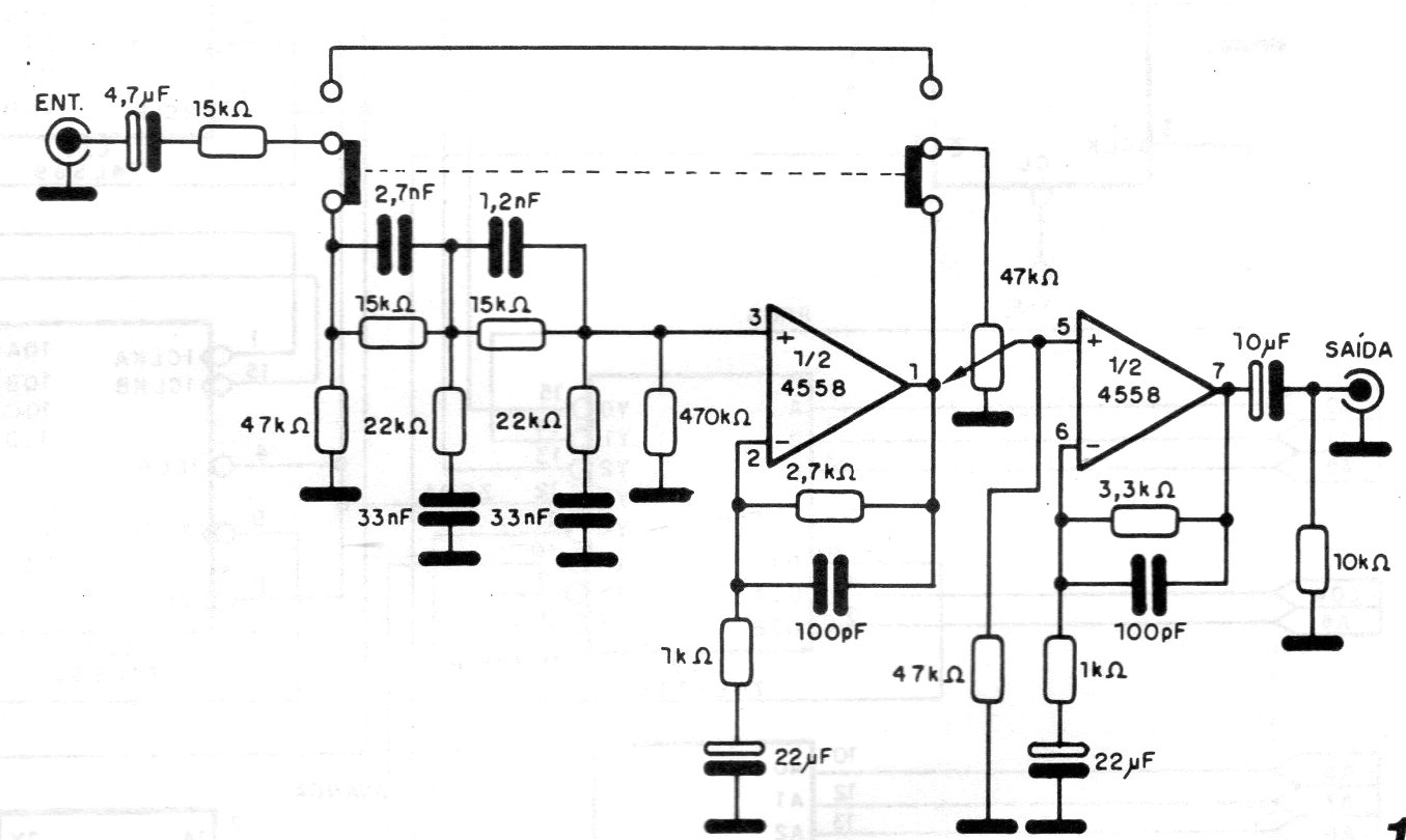 This audibility or loudness control for sound equipment is from 1992 documentation. The circuit uses operational and requires symmetrical power supply. The audio input and output cables must be shielded. The circuit includes a volume control. The power source is given in CB16761E.