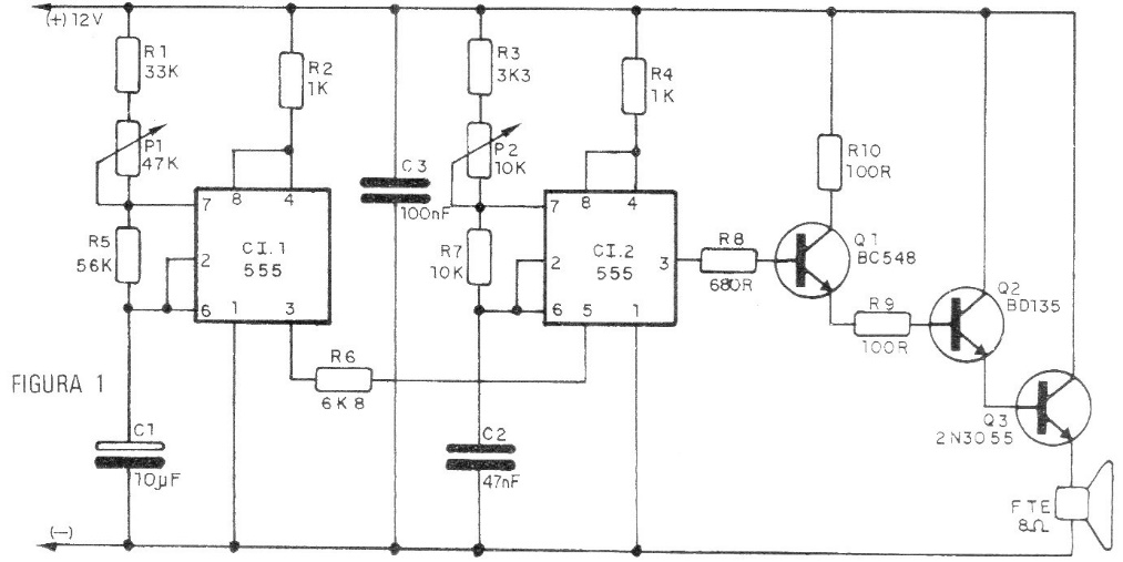 We obtained this circuit in a 1987 publication. It is the traditional French siren configuration with two 555 integrated circuits and a high-power stage with a 2N3055 transistor. This transistor must be mounted on a heatsink. The adjustment of the sound effect must be done in the trimpots and the circuit powered by a 12 V source of at least 2 A or battery.