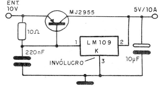 This simple regulator provides a voltage of 5 V with a current of up to 10 A. The transistor must have an excellent heat sink. The LM109 integrated circuit is uncommon today, but equivalent 3-terminal regulators like the 7805 can be used.