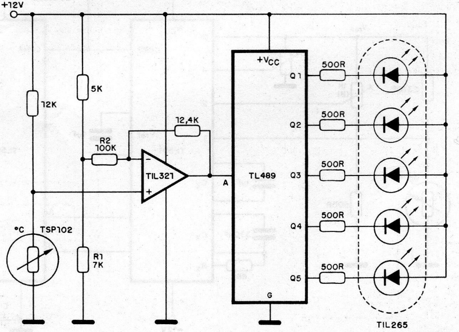 The circuit shown is suggested by Texas Instruments and uses the TL489 as a base, thus providing 5 levels of temperature indication in the range of 25º C to 125º C. Its main application is automotive. The first LED lights up when the temperature exceeds 25 ° C, the second when it exceeds 50 ° C and thus up to 125 ° C in 25 ° C steps with excellent accuracy. For 20 ° F steps, two components must be changed: R1 changes to 460 ohms and R2 changes to 6k2.