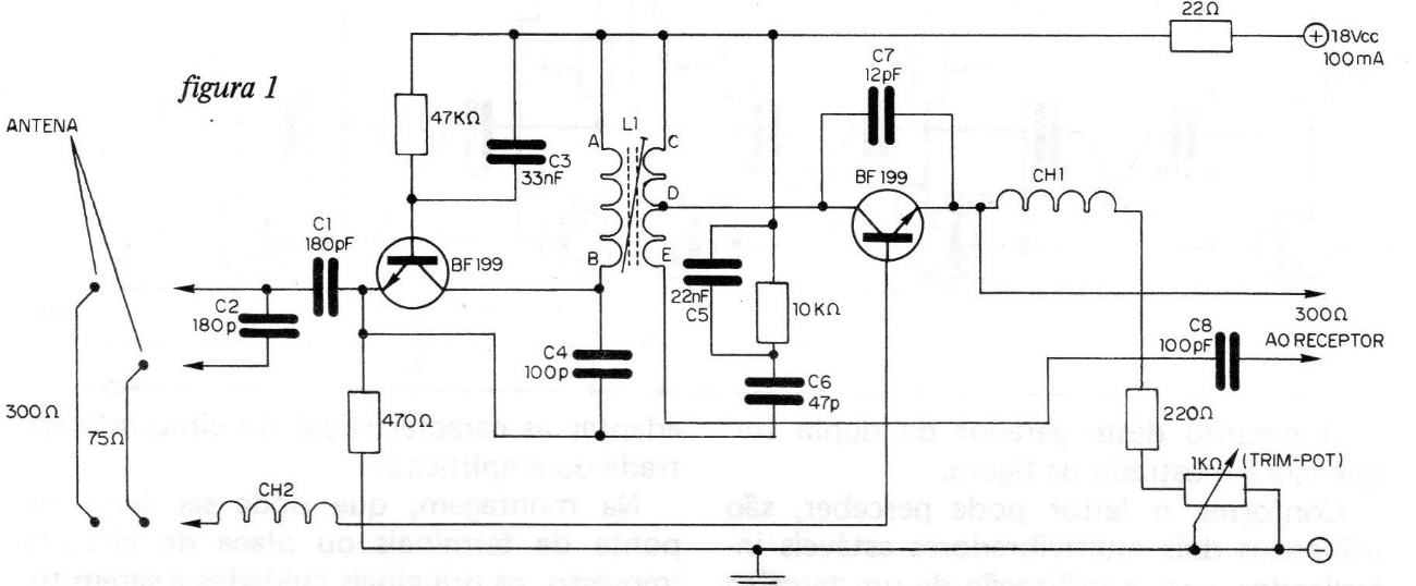 The signals from weak TV, FM and VHF stations can be amplified to assist their reception in locations away from broadcasters. The circuit shown in the figure uses two high frequency transistors, type BF199, and can be interleaved between the TV, FM or VHF receiver antenna and the receiver, this via a 75 or 300ohms cable. According to the author of the project, stations that in normal conditions arrive very weak, can be received with excellent quality of sound or image (as the case may be), as if they were next to home. The only adjustment necessary for the operation of the device is the L1 core, for maximum signal strength at the desired station. The trimpot helps to eliminate local noise or interference. The components are not critical, but when assembling, if bridged, care must be taken that the connections are as short as possible between all parts. L1 is an oscillating coil for FM (green color), while CH1 and CH2 are RF shocks wrapped in a 100k x 1/8 W resistor. The number of turns in each is 32 and the wire used is AWG 34. The resistors are all de W with 10% tolerance. The amplifier requires a special source, which is shown in the same figure. This power supply uses a 9 + 9 V x 100 mA transformer and 4 bridge diodes, in order to obtain approximately 18 V. at its output. Capacitors C1 and C2 are ceramic. C3 and C5 are metallized polyester capacitors, while the others are ceramic, disc type.