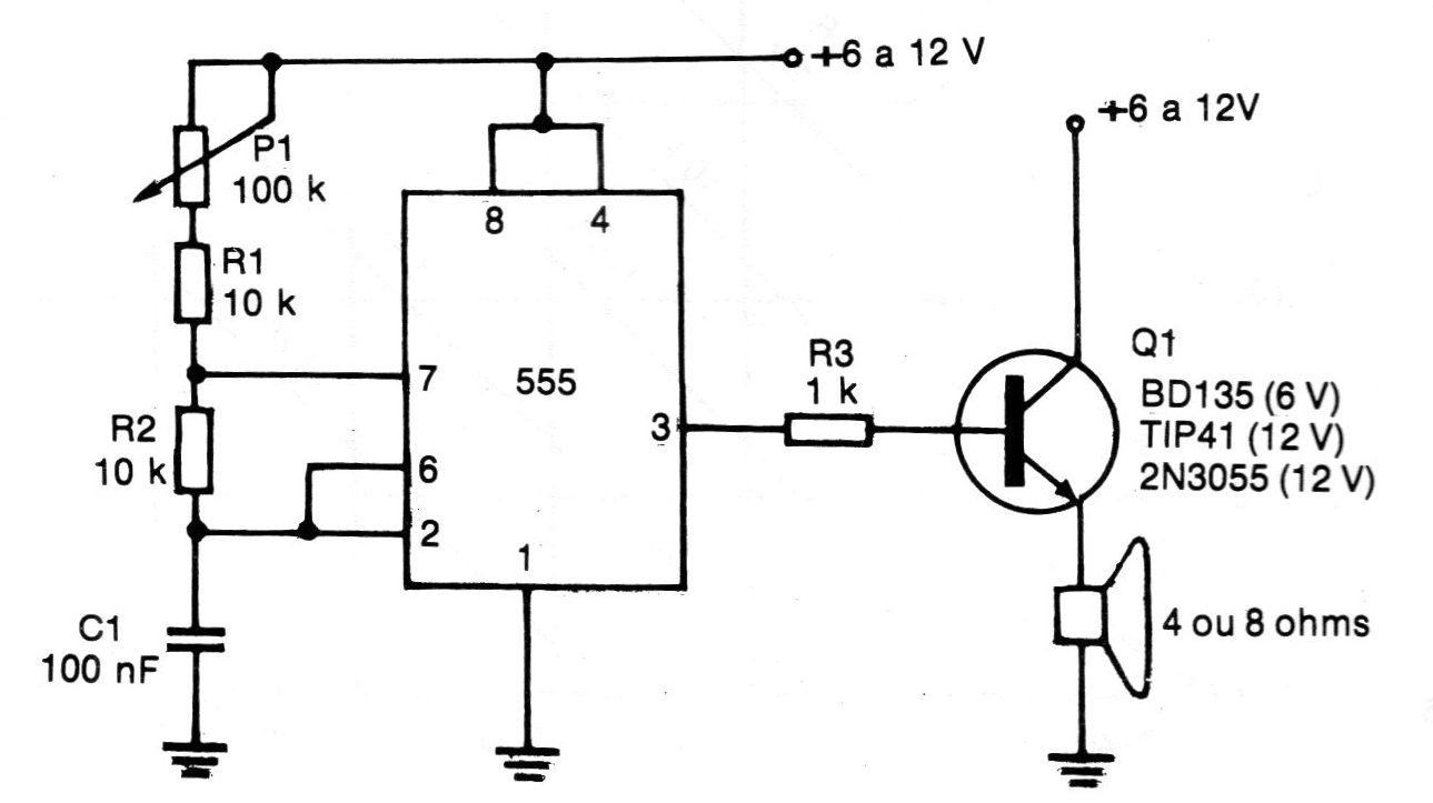 This traditional circuit with the 555 was found in a 1984 documentation. In this oscillator, the signal obtained has much greater intensity and can be applied to a speaker or other similar device, such as a low impedance headset. With a supply of 6 V, we obtain a power of approximately 1 W and with a supply of 12 V this power approaches 4 W, so it is necessary to mount the transistor in a good heat radiator. The tone is continuous, and its frequency is adjusted in the pot. For a different range of frequencies, just change the capacitor. For a supply of up to 6 V, medium power transistors with collector currents (IC) typically between 1 and 3 A, such as BD135, BD137, BD139, TIP29, TIP32, etc., can be used. For a 12 V supply, transistors with currents from 6 A, such as TIP41, 2N3055, etc., must be used. The speaker must be 4 or 8 ohms, capable of withstanding a power of at least 10 watts.