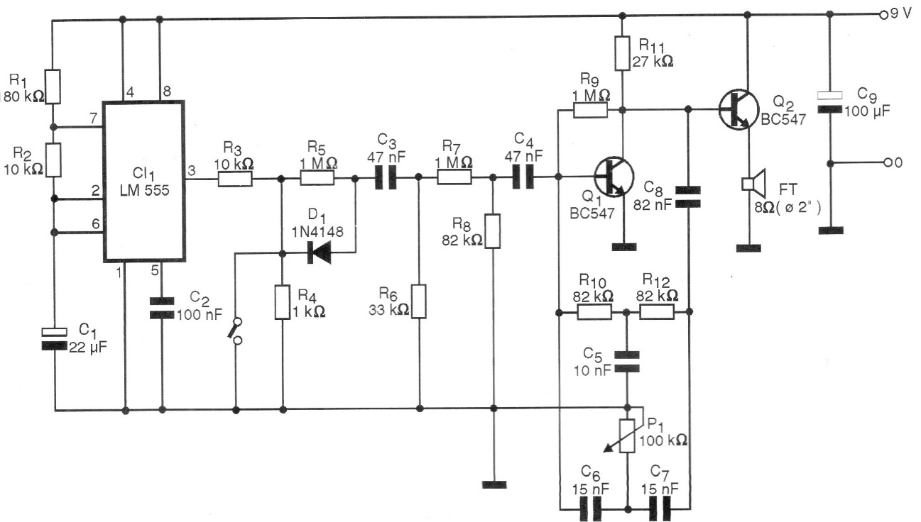 This circuit from a 1998 publication can be used as an entry bell, as a calling device or in other applications. The components are common even today, and for greater power an external amplifier can be used. The damping adjustment is done in the trimpot; The power must be supplied by source or batteries.
