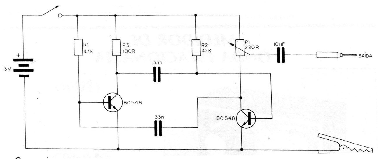 This signal injector is of great use in the troubleshooting of radio receivers and amplifiers. What we have is basically an astable multivibrator whose frequency is determined by the 33 nF capacitors and the 47k R1 and R2 resistors. The rectangular waveform obtained from this circuit is rich in harmonics, which means that we not only have the basic audio signal but signals that can be tuned even in the highest bands of short-wave receivers and even FM. amplifiers.