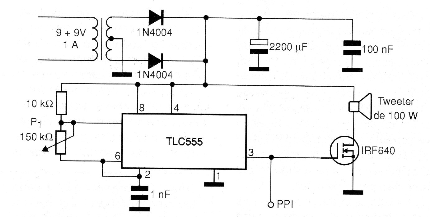The proposed circuit generates signals in the range between 9 kHz and more than 44 kHz, which, it is proven, frightens mosquitoes when applied to a tweeter. The circuit also disturbs other animals that have sensitive ears or that hear ultrasound such as rats, dogs, cats, etc. The adjustments must be made experimentally and to check the operation, a frequency meter connected to P1 can be used. The power field effect transistor supports equivalents and must be equipped with a small heat radiator. The primary winding of the transformer must have voltage according to the local network. Tweeters from 20 W can be used, giving preference to piezoelectric types that reach higher frequencies.