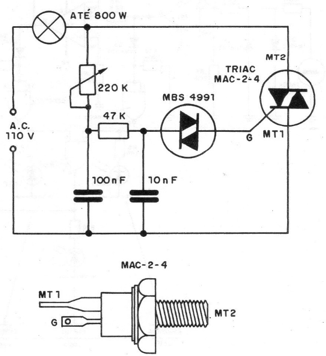 This is a conventional triac dimmer configuration found in a 1986 documentation. The triac used is a MAC-24 (200 V x 8 A) common at the time, which has a housing for installation in a large heat sink.