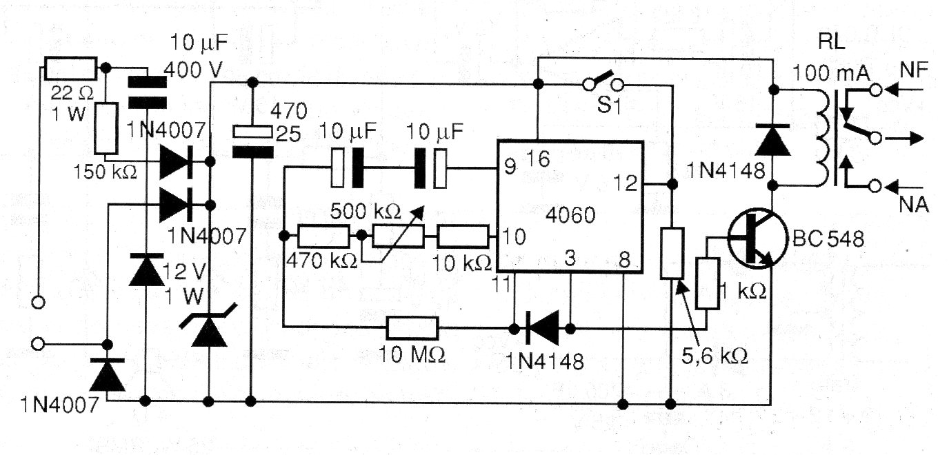 The source used in this timer is of the type without transformer and regulated by the 7 W zener. The 1 k resistor must be replaced by one of 680 ohms or less if the relay refuses to be activated. S1 is the reset of the circuit that works in both 110 V and 220 V. The timing adjustment is made in the 500 k ohms trimpot and the maximum interval is determined by the 10 uF capacitors. The source diodes can be 1N4007 or equivalent. We observed that this circuit is not isolated from the power grid.