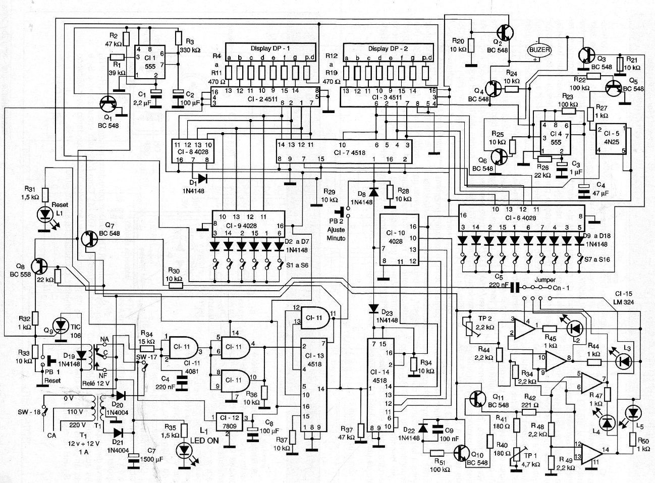 Of course, the circuit also serves other applications, such as controlling chemical and other processes. The operation is as follows: set the end time using key S1 to S16. For example, to set 5 minutes, close switch S1 and S12. Then close the SW-17, which will make the beep sound for approximately 20 seconds indicating that the timer is on. The programmed time will appear on the display and then touch for one minute. We have a sensor formed by diode D22 (1N4148) that serves as a thermometer, and with that it can be used to control the cooking of beans. The procedure for time is the same. The cooking time is adjusted, for example 35 minutes.