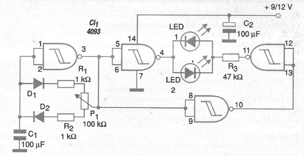 With this circuit it is possible to control two LEDs of different colors, making their color combination. The circuit can be powered by voltages from 5 to 12 V and the current on the LEDs is determined by R3, which can have values between 1k and 47k.