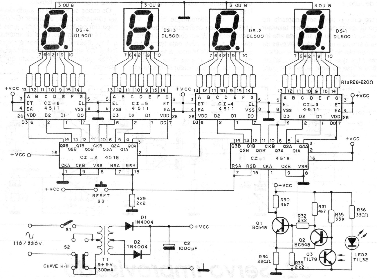 This four-digit circuit was found in a 1990 documentation. The sensor can be a contact or reed type coupled, for example, to a crank to count a coil. It can also be used as in the original an optical sensor to count the passage of an object or the teeth of a gear.