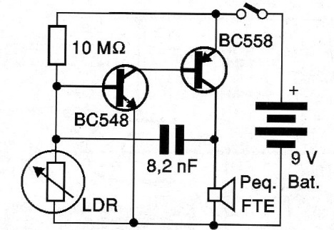 This circuit, found in 2002 documentation, generates a strong audio tone when the light in the place where it is located is turned off. The circuit was originally intended to scare people, but it can be used as an alarm. The power, in fact, can be made by voltages of 6 to 12 V.