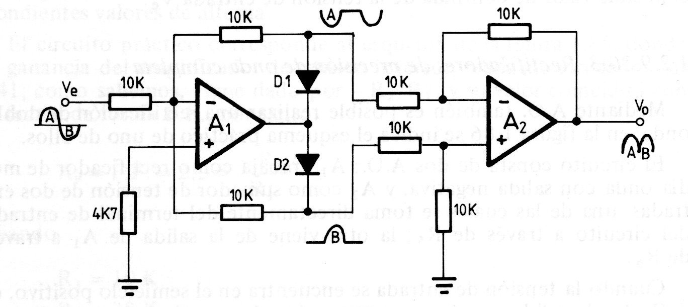 This circuit uses two operational amplifiers, which can be of the type 741, in a full wave rectifier normally used in instrumentation. The circuit requires a symmetrical source, and the diodes can be general-purpose types. Observe the waveform of the input and output signals.
