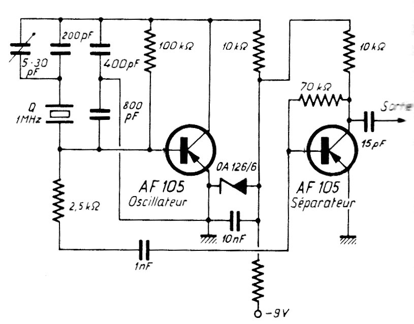This circuit was found in a 90s schematic manual published in Europe. The circuit uses two PNP RF transistors, but the polarity of the supply can be reversed so that the circuit uses NPN transistors like the BF245. The crystal can have frequencies up to about 40MHz. The trimmers adjust the oscillation points.