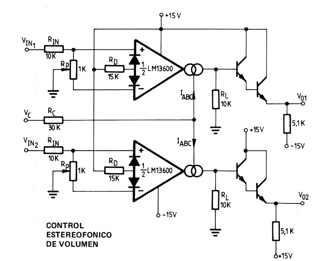 This two-channel DC volume control uses a transconductance operational amplifier. The transistors can be used in general as the BC548 and the supply must be made with symmetrical source. The circuit is a documentation in Spanish about operational amplifiers.
