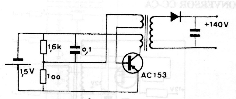 This voltage inverter allows you to raise the voltage of a battery to values as high as 140 V depending on the transformer. Transistor equivalents like the BD136 can be used. The output current is a fraction of mA.