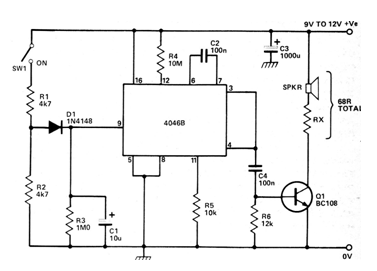 The CMOS 4046 integrated circuit is not very common today, consisting of a very efficient PLL for many low and medium frequency applications. The circuit presented is from documentation translated from the 1960s. The circuit consists of a VCO that is controlled by a switch that produces a fast-increasing frequency signal and a slow decreasing frequency. The load impedance can be reduced with the use of a power transistor like the BD135.