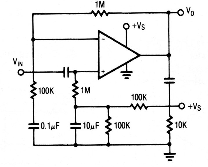 This circuit was obtained in an old manual valid for practically any type of operational amplifier. The supply voltage depends on the amplifier. The power supply does not have to be symmetrical.