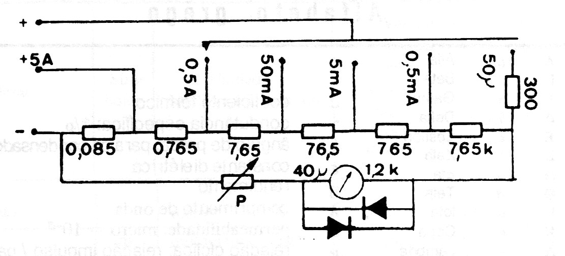 This ammeter measures currents in 5 ranges from 50 uA to 0.5 A using a 40 uA instrument, which can be replaced by the lower current range of a multimeter. The accuracy of the circuit depends on the accuracy of the resistors used as the shunt.