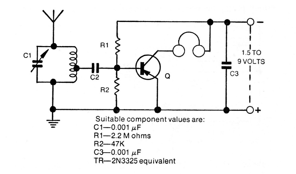 Any general-purpose germanium or silicon PNP transistor can be used on this receiver. The handset must be of high impedance with at least 2 k and the supply can be made with voltages from 1 to 9 V. The coil has 20 + 70 turns of wire 28 or 30 in a ferrite rod.