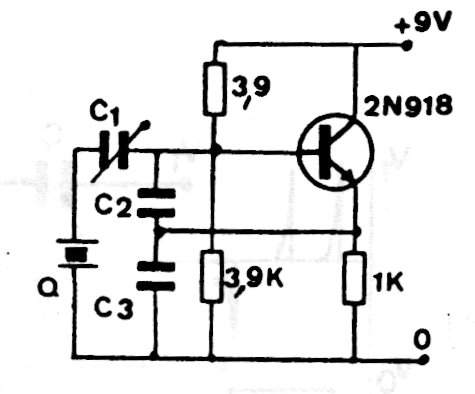 This oscillator can generate signals from 100 kHz to more than 50 MHz depending on the crystal used and the transistor, which can also be 2N2222. Capacitors must be ceramic and typical values are between 47 pF and 220 pF depending on the frequency.