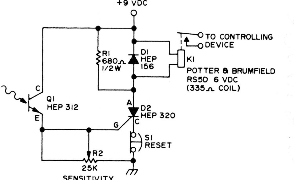 This simple system for opening garage doors by the headlight was found in a 1975 documentation. The SCR can be the TIC106, and the relay is 6 V, despite the 9 supply, as the voltage drop in the SCR must be considered.