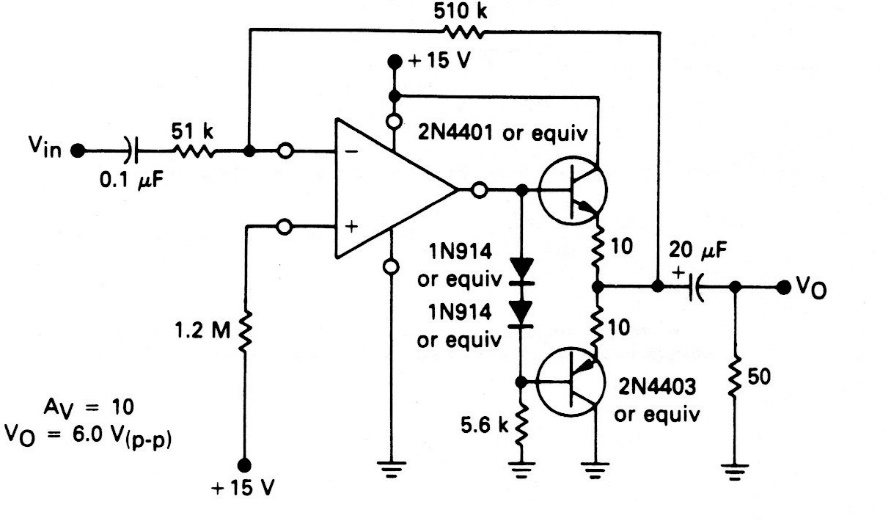 This circuit is from an old operating manual and can be implemented with operationals types that depend on the application. The power source does not have to be symmetrical and the transistors support equivalents.