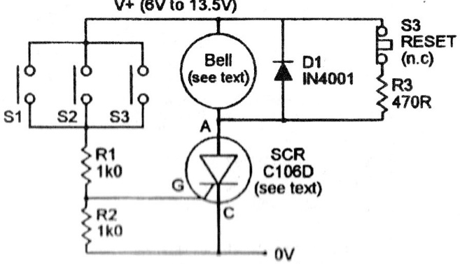 This circuit uses NO sensors and was found in an American publication in the 90s. The supply must be made with 2 V more than the voltage of the warning system, to compensate for the voltage drop in the SCR while driving.