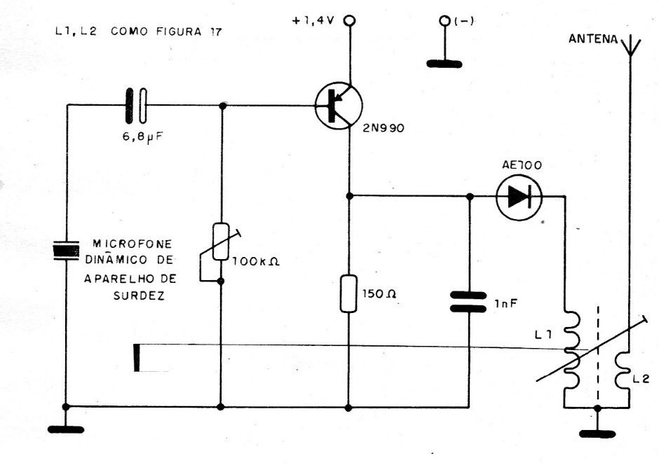 This low power circuit for the FM band was found in a spy book from the 90s. The tunnel diode is not an easy component to obtain and the power can be supplied with a single button cell. This circuit is simpler than the previous one, as it uses only one transistor. The coils are as shown in the previous project.