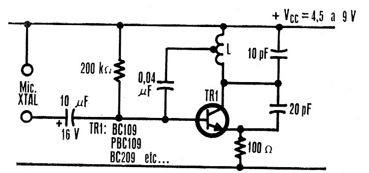 Low power RF transistors such as the BF494 or BF495 and even those in the BC series can oscillate well in this circuit of old documentation. The coil has 2 + 2 turns of wire 26 or 28 in the form of 1 cm in diameter without core. Low-value capacitors must be ceramic, and the antenna must be 10 to 30 cm in diameter.