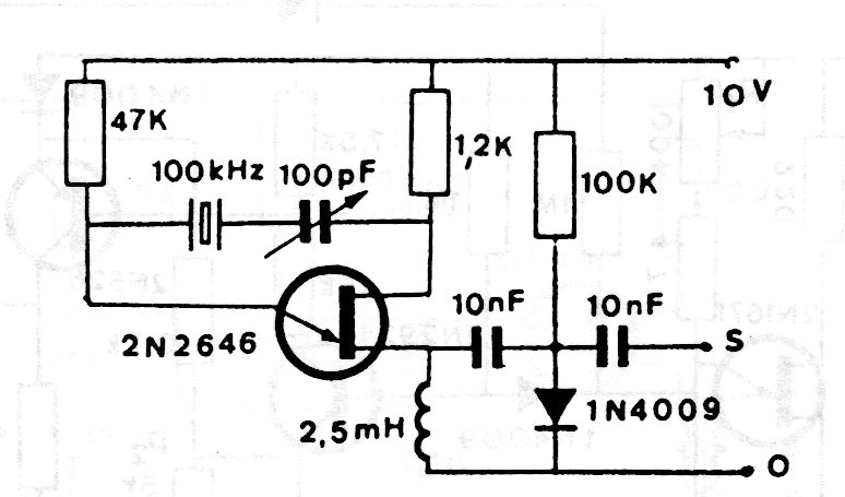 This oscillator uses a crystal to set the frequency. The operating limit of the unijunction is in the order of 100 kHz. Power supply can be between 10 and 20V.