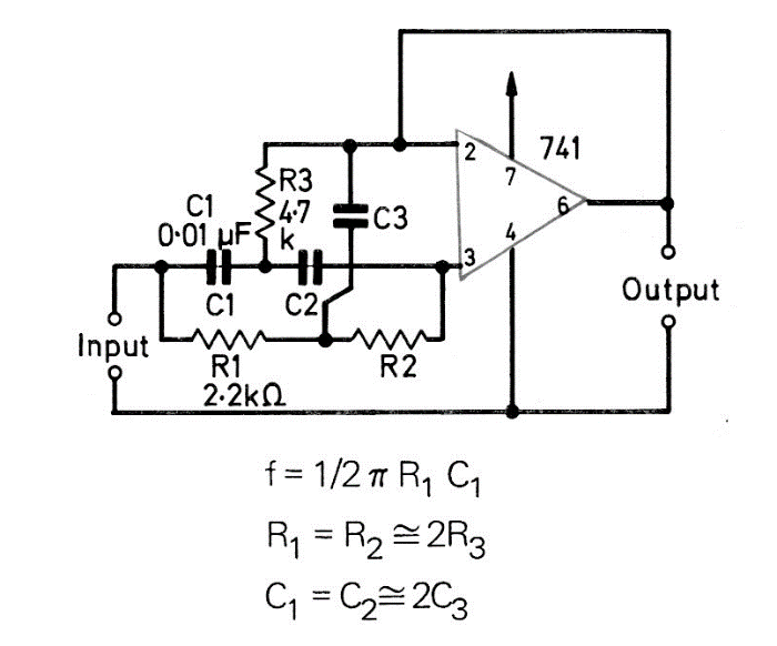 Other operational amplifiers can be used in this conventional filter that rejects only one frequency. The components are calculated using the formulas next to the diagram and the supply voltage can be between 6 and 15 V. For other, more modern operational amplifiers, the voltage can be lower.