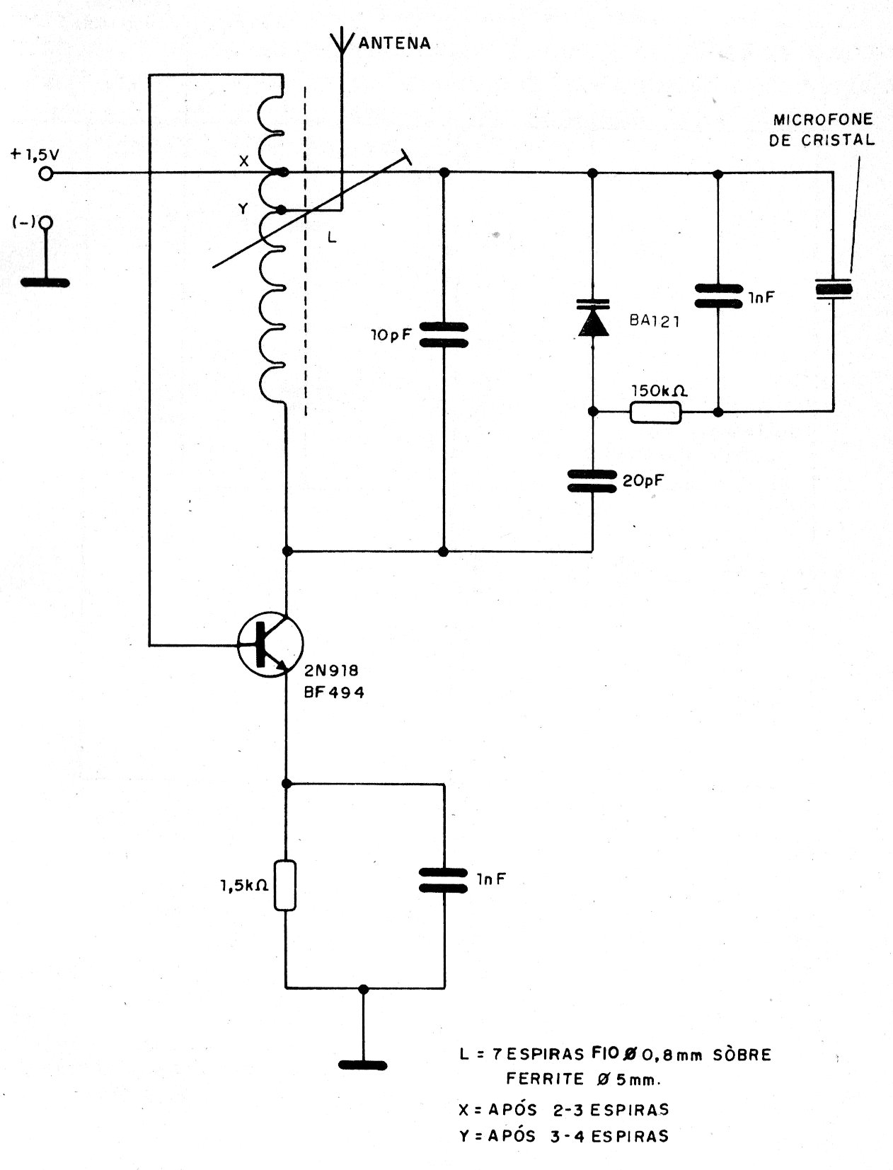 This circuit works with only one battery, providing a range of a few tens of meters. We found it in a spy book from the 80s. The characteristics of the coil are given next to the diagram. The antenna is 15 to 30 cm long.