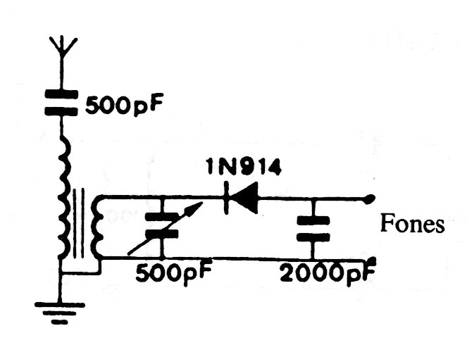 This crystal radio version using a detector diode was found in documentation from the 90s. The primary of the coil has 80 turns and the secondary 30, wrapped in a ferrite rod. The handset must be high impedance or crystal and the antenna must be long.
