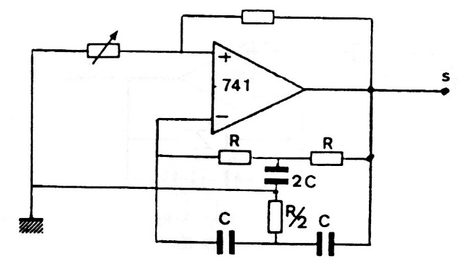 This circuit appears with variations in other points of this section. This version is from European documentation from the 1980s and the circuit must be powered by a symmetrical source. The frequency depends on C and is set in the pot (100 k). The unmarked resistor can be from 100 k to 1 M.