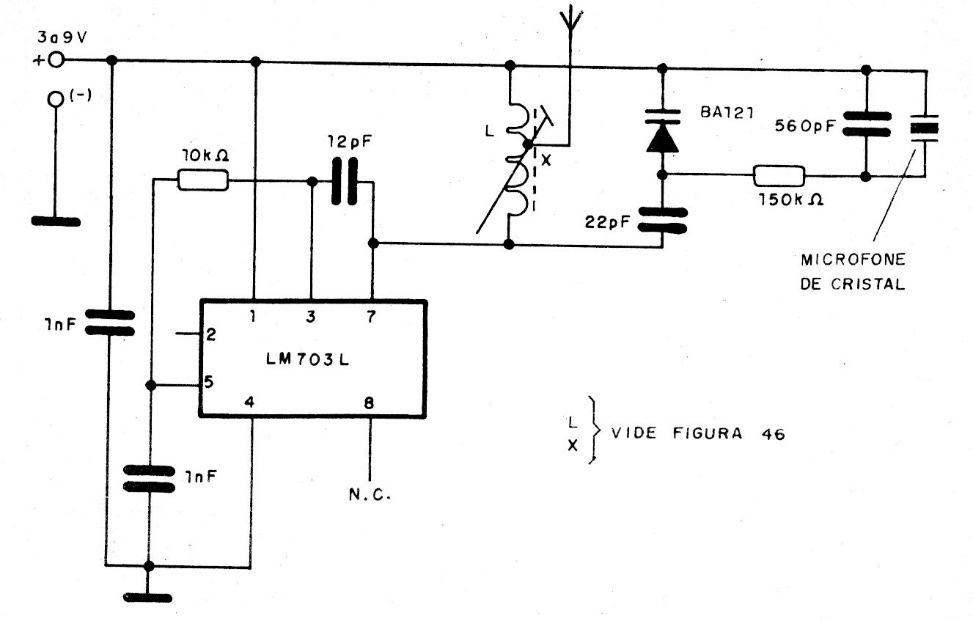 The integrated circuit used in this small spy transmitter is not easy to obtain today. The coil is the same as the CIR12942 and the supply is made by voltages from 3 to 9 V. The microphone can be either ceramic or crystal.