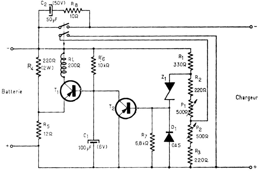 This circuit, for automotive use, was obtained in a European publication from the 1980s. The transistors are from that time and can be replaced by modern equivalents such as BD136. The relay is a sensitive type with 12 V voltage and must be connected to an unregulated source.