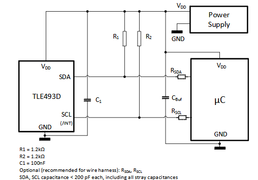 This shield circuit for microcontroller with the TLE493D sensor is from Infineon's component datasheet. The component values are given next to the diagram and in the datasheet the reader can obtain more information about its use.