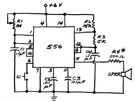 In fact, the 556 consists of a double 555, which can be replaced by these integrated ones. The circuit is from American documentation and the output load can have a lower resistance, up to 120 ohms, for a higher volume. The circuit can be powered with voltages from 5 to 12 V.