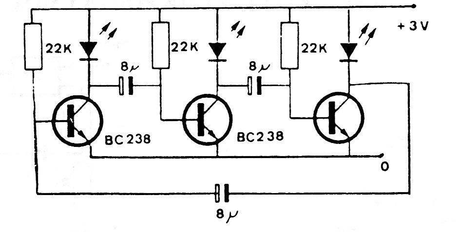 This circuit generates a multiple Inal with 3 outputs and whose frequency depends on the values of the capacitors used. With the indicated values we have the production of a very low frequency signal. The circuit causes the LEDs to flash in an almost sequential manner.