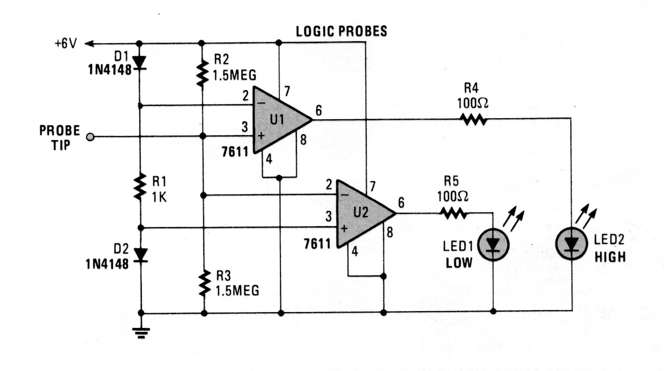 The integrated circuit used in this application is not very common. The circuit is intended for testing both TTL and CMOS circuits depending only on the supply voltage. We found this circuit in not very old American documentation.