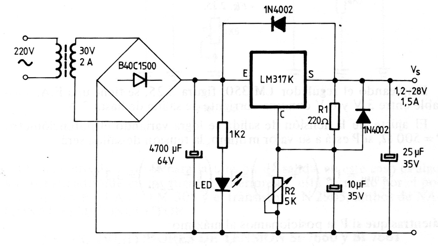 This is the traditional source using the LM317 3-terminal regulator circuit. The same source can be implemented with the LM350K for a current of 3 A. The circuit is from an old manual, but totally current. The integrated circuit must be mounted on a heat sink and the diodes are for 1.5 V in the original version and 3 A with the LM350k.