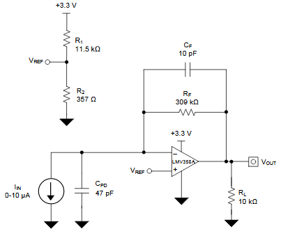 The integrated circuit used in this application is the Texas Instruments LMV358A, a low voltage operational amplifier. The circuit converts currents from 0 to 10 uA into voltages from 0.1 to 3.2 V. The supply is made with 3.3 V.