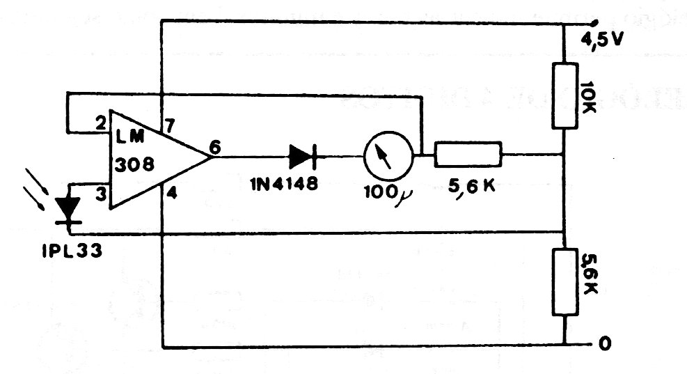 The sensor of this circuit is a photodiode. Equivalent operations can be used, and the instrument can be replaced by the lower current range of a standard multimeter.