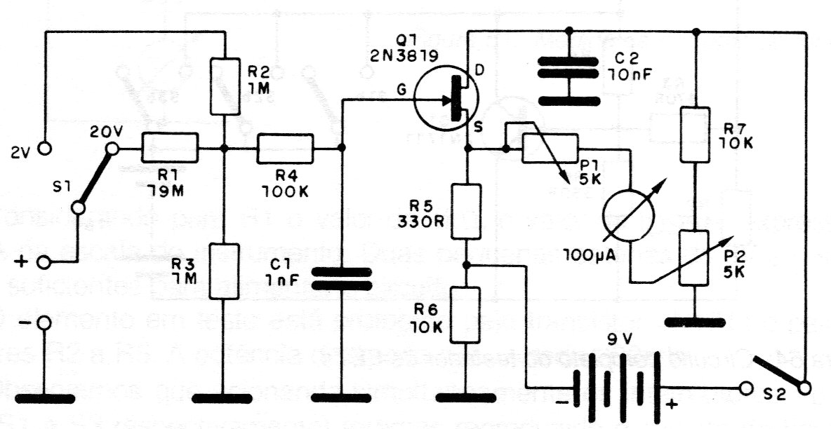 This sensitive voltage measuring circuit has a very high input resistance, of the order of Mohms, and can be used with the lowest current range of a common analog multimeter, to increase its sensitivity. The FET can be the BF245 or equivalent and the power is provided by a 9 V battery.