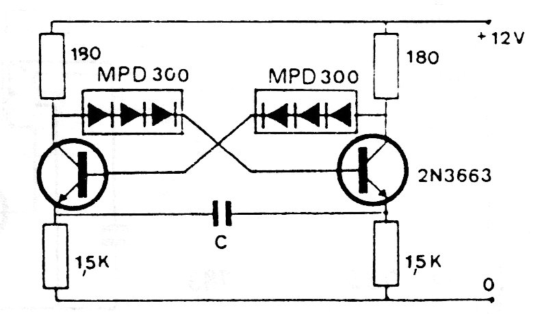 This unusual configuration, but which has already been explored in other articles, uses diodes in the feedback circuit. The characteristics of these components determine the frequency. Transistors can be of general use and the supply voltage can typically be between 9 and 15 V.´