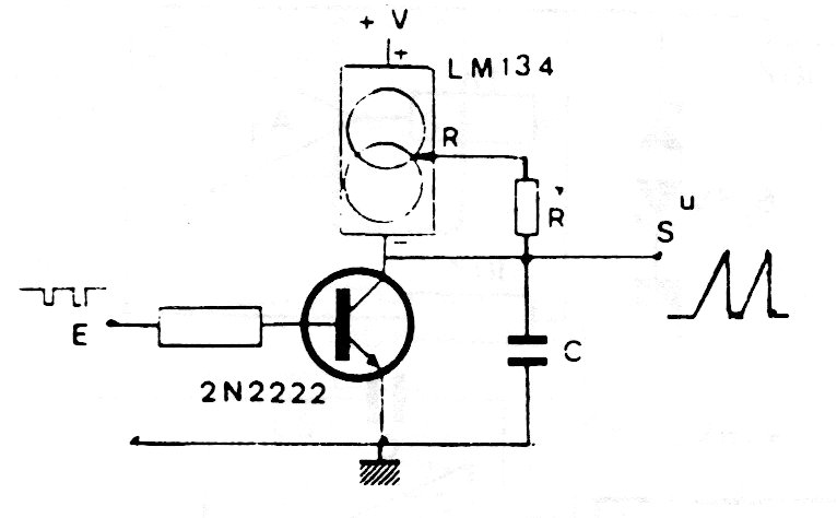 The LM134 integrated circuit is not very common today. This circuit generates linear low-frequency ramps and was found in a technical documentation from the 1980s. The resistor depends on the intensity of the command signal, typically between 1k and 10k.