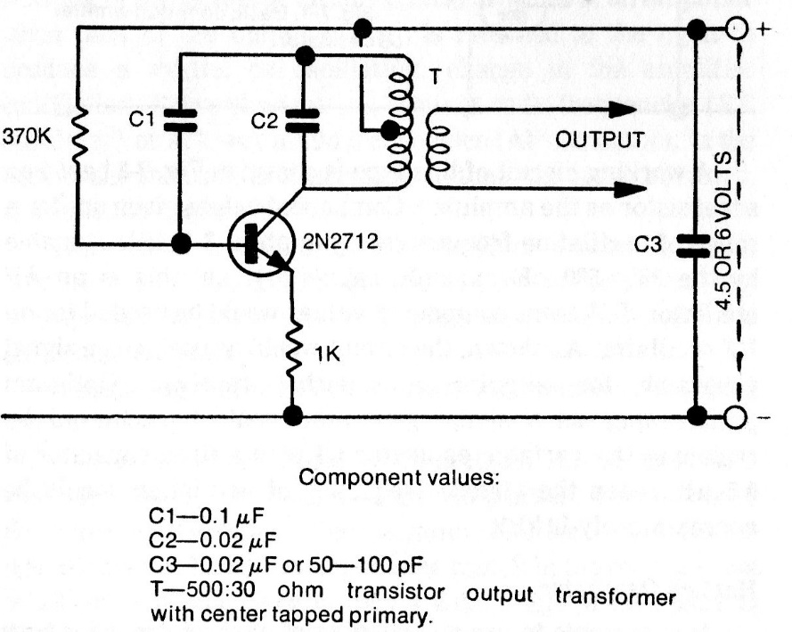 The frequency of this oscillator depends on T, which for the audio band can be a common output transformer for transistors. For the RF band it can be wrapped around a ferrite rod. The transistor can be the BC548 and the maximum frequency is in the order of a few tens of megahertz.