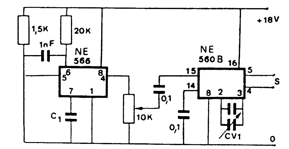 This circuit can generate signals of frequencies up to 1 or 2 MHz, tuned in the capacitor. The circuit is modulated, and the integrated ones used are not very common today. We found this application in an 80s circuit manual.