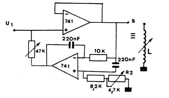 This circuit simulates an inductance that depends on the values of the components used, but that can be varied over a wide range of values. Operational Amplifiers must have symmetrical fonts and equivalent types can be used.