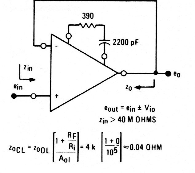 The operational used is like the 741 and the voltage gain is unitary. The circuit is from the component manual and requires a symmetrical source.
